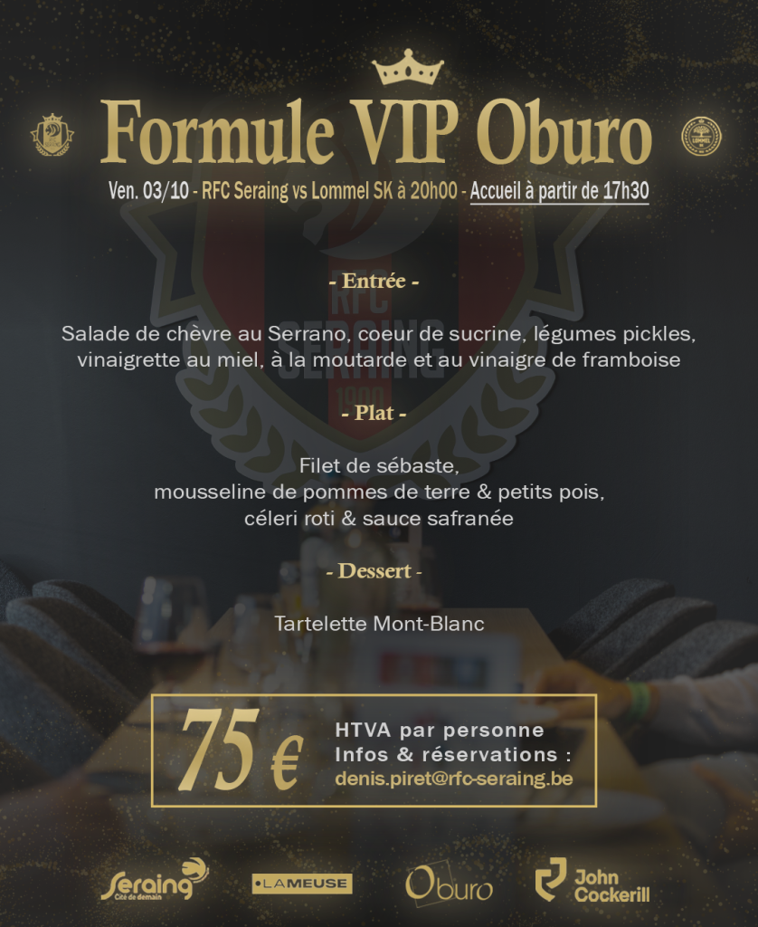 ✍️ Vous souhaitez réserver votre formule VIP pour cette rencontre ou l’un de nos prochains matchs ? Contactez directement notre responsable commercial, Mr. Denis Piret, à l’adresse suivante : denis.piret@rfc-seraing.be