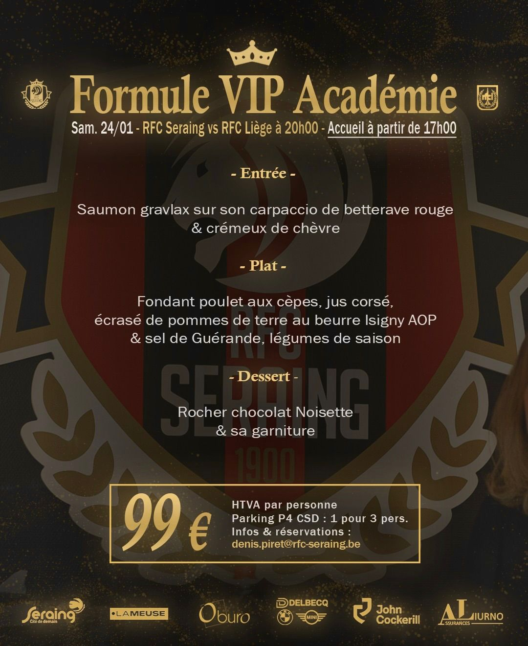 ✍️ Vous souhaitez réserver votre formule VIP pour cette rencontre ou l’un de nos prochains matchs ? Contactez directement notre responsable commercial, Mr. Denis Piret, à l’adresse suivante : denis.piret@rfc-seraing.be