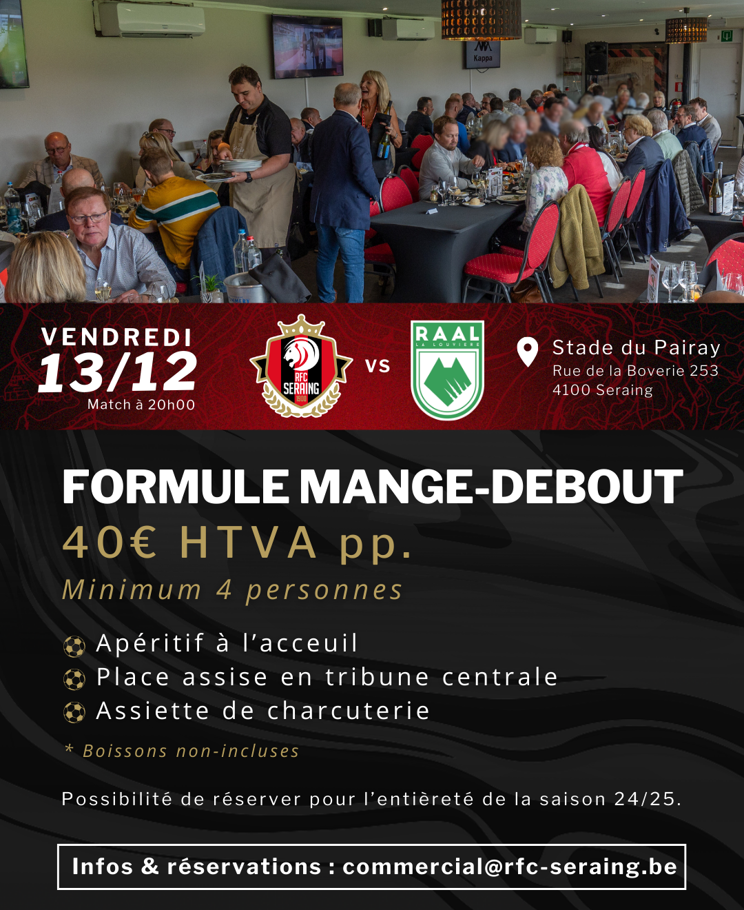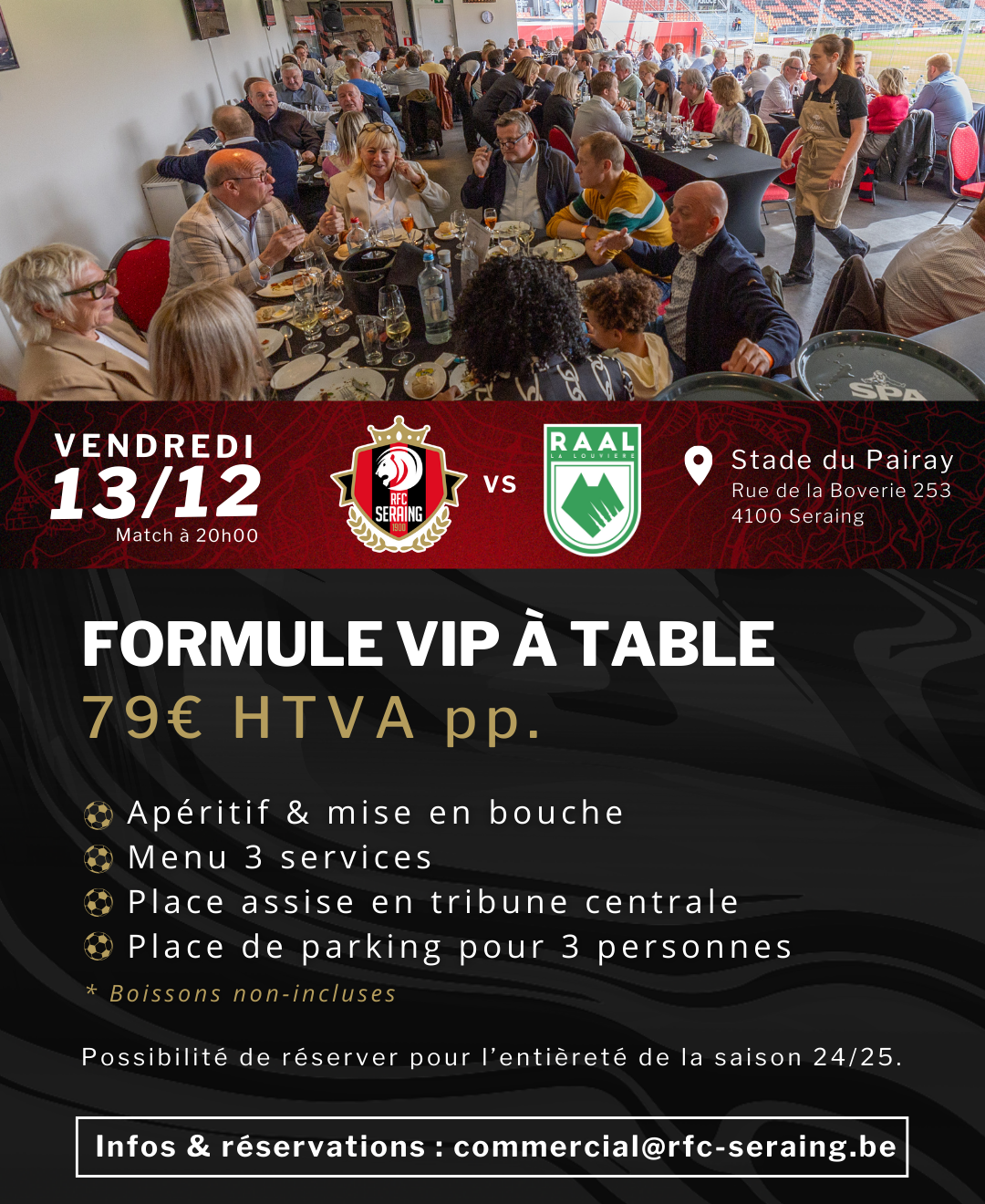 ✍️ Vous souhaitez réserver l’une de nos deux formules pour cette rencontre ou l’un de nos prochains matchs ? Contactez directement notre responsable commercial, Mr. 𝗣𝗶𝗲𝗿𝗿𝗲-𝗢𝗹𝗶𝘃𝗶𝗲𝗿 𝗗𝗶𝗿𝗶𝘅, à l’adresse suivante : commercial@rfc-seraing.be