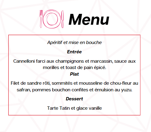 - 18h00 : Début du repas en 3 services