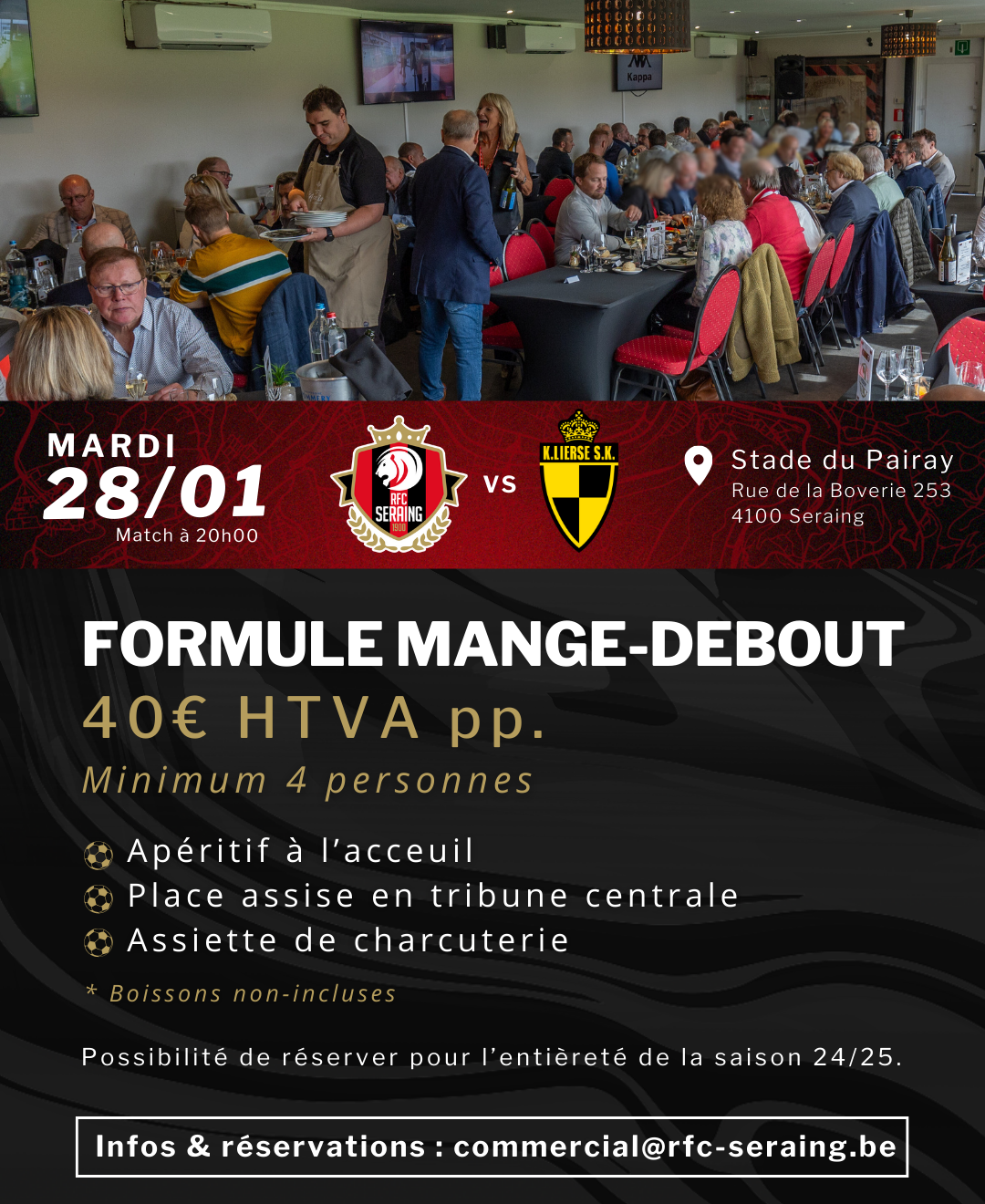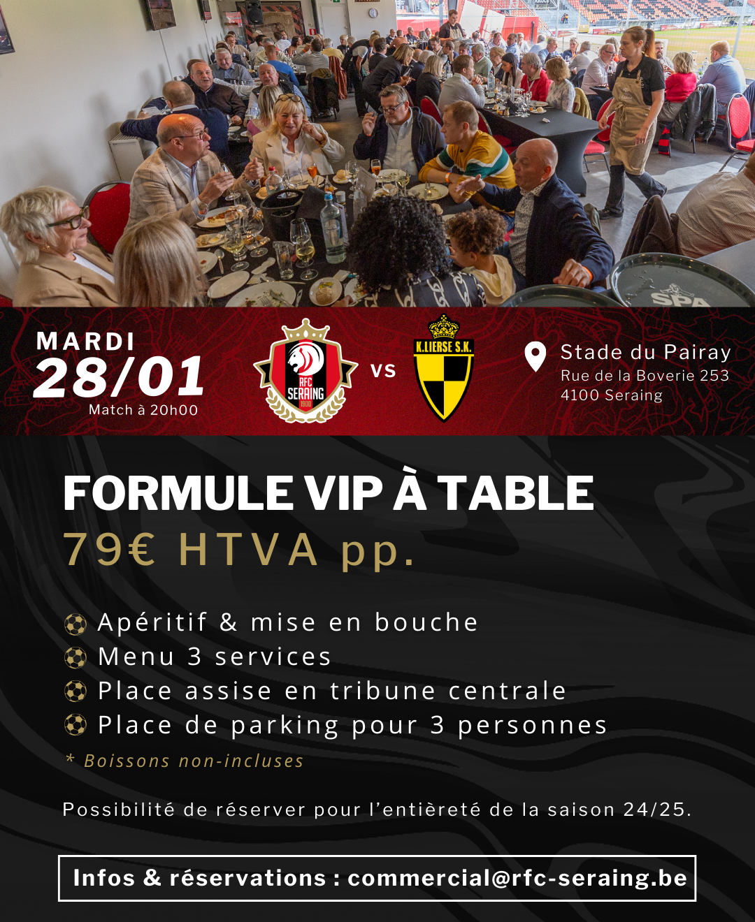 ✍️ Vous souhaitez réserver l’une de nos deux formules pour cette rencontre ou l’un de nos prochains matchs ? Contactez directement notre responsable commercial, Mr. 𝗣𝗶𝗲𝗿𝗿𝗲-𝗢𝗹𝗶𝘃𝗶𝗲𝗿 𝗗𝗶𝗿𝗶𝘅, à l’adresse suivante : commercial@rfc-seraing.be
