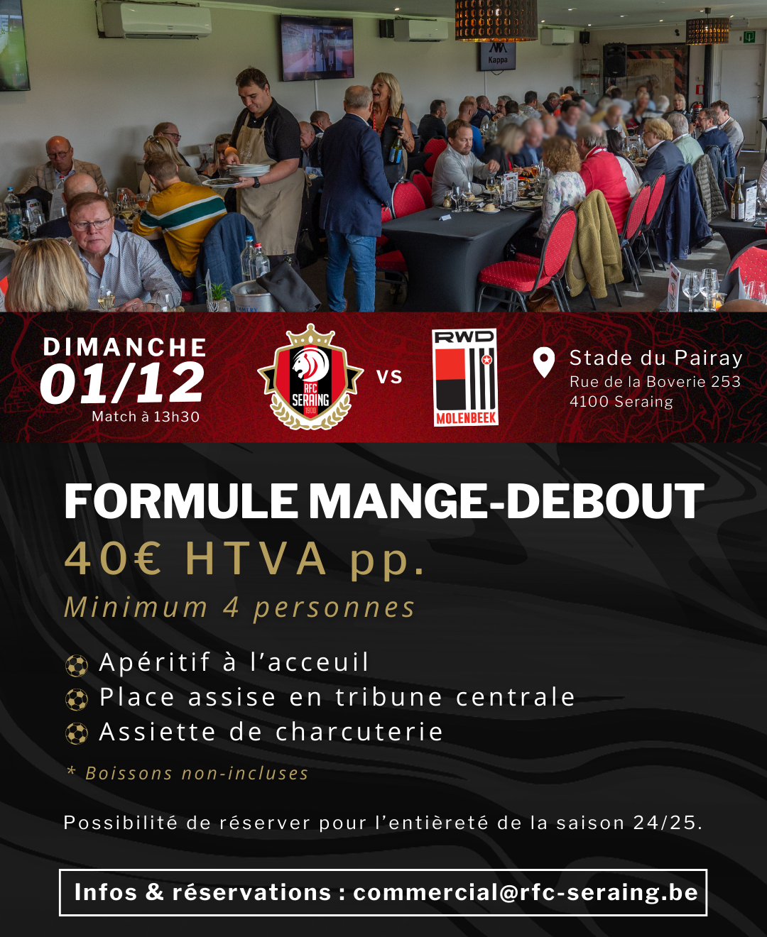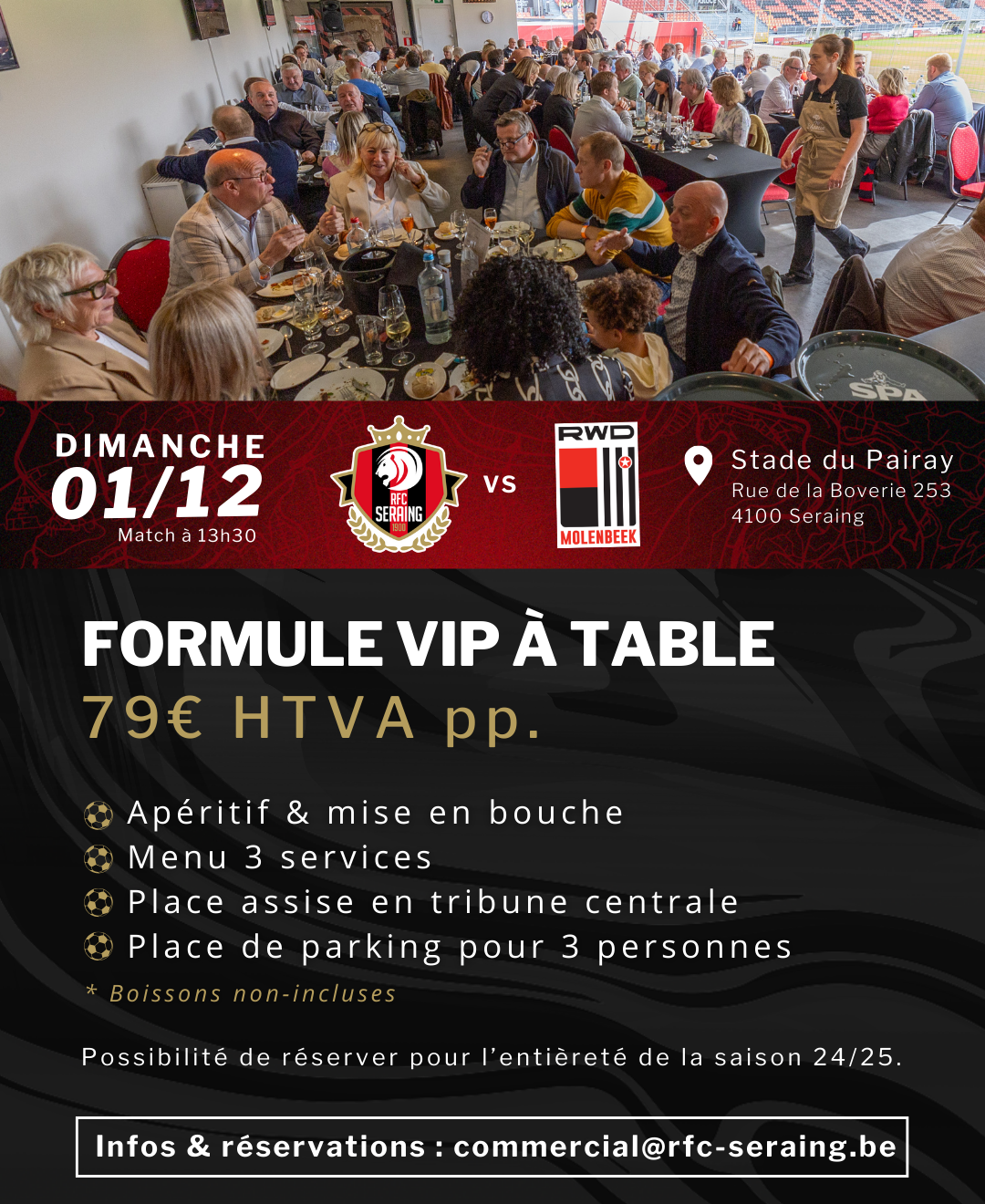 ✍️ Vous souhaitez réserver l’une de nos deux formules pour cette rencontre ou l’un de nos prochains matchs ? Contactez directement notre responsable commercial, Mr. 𝗣𝗶𝗲𝗿𝗿𝗲-𝗢𝗹𝗶𝘃𝗶𝗲𝗿 𝗗𝗶𝗿𝗶𝘅, à l’adresse suivante : commercial@rfc-seraing.be