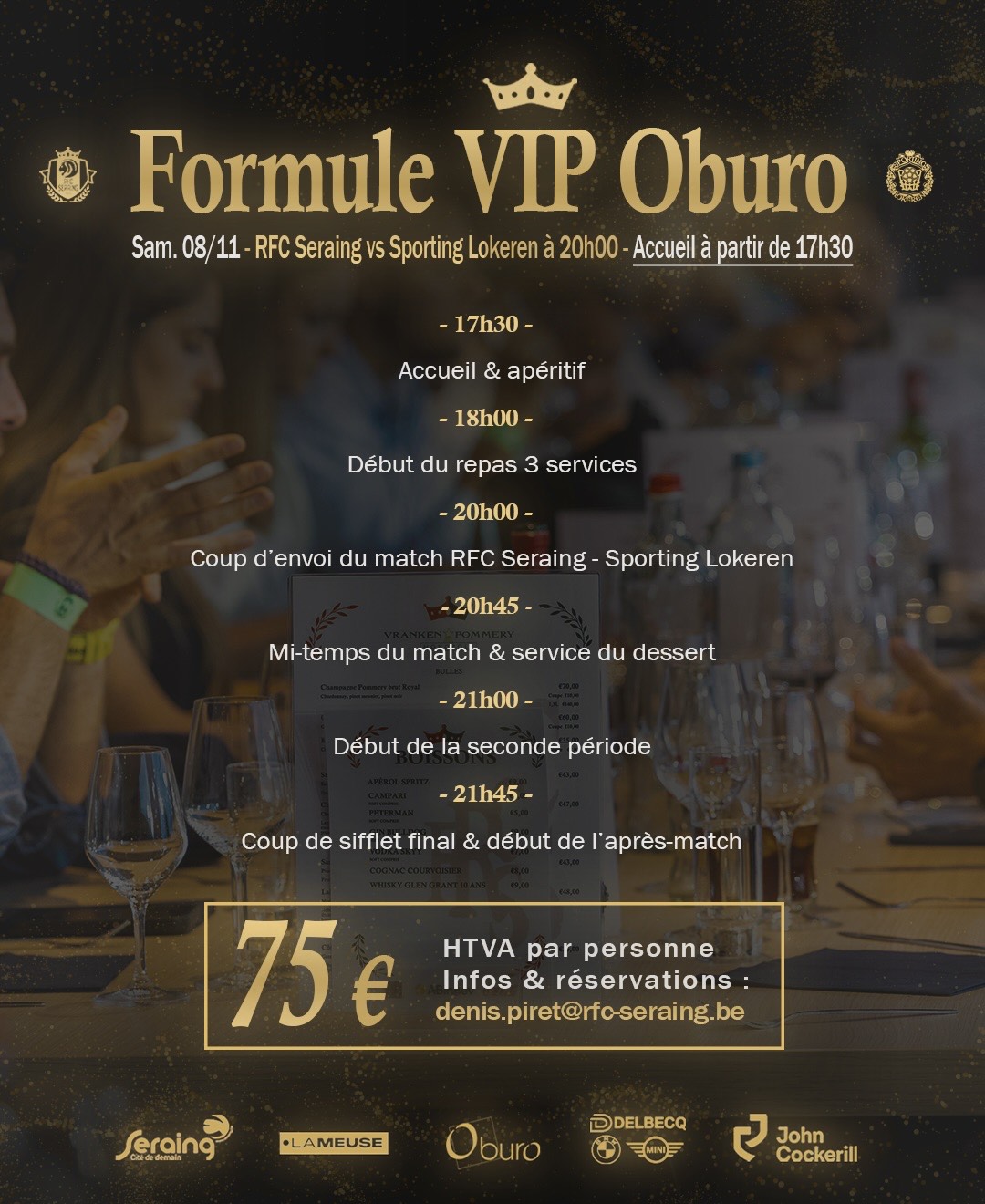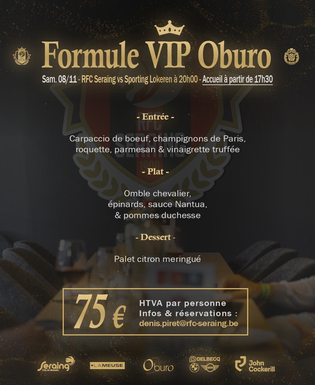 ✍️ Vous souhaitez réserver votre formule VIP pour cette rencontre ou l’un de nos prochains matchs ? Contactez directement notre responsable commercial, Mr. Denis Piret, à l’adresse suivante : denis.piret@rfc-seraing.be