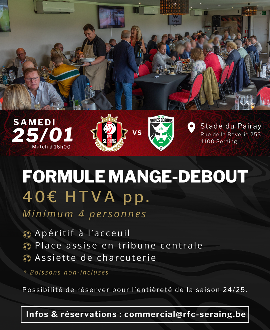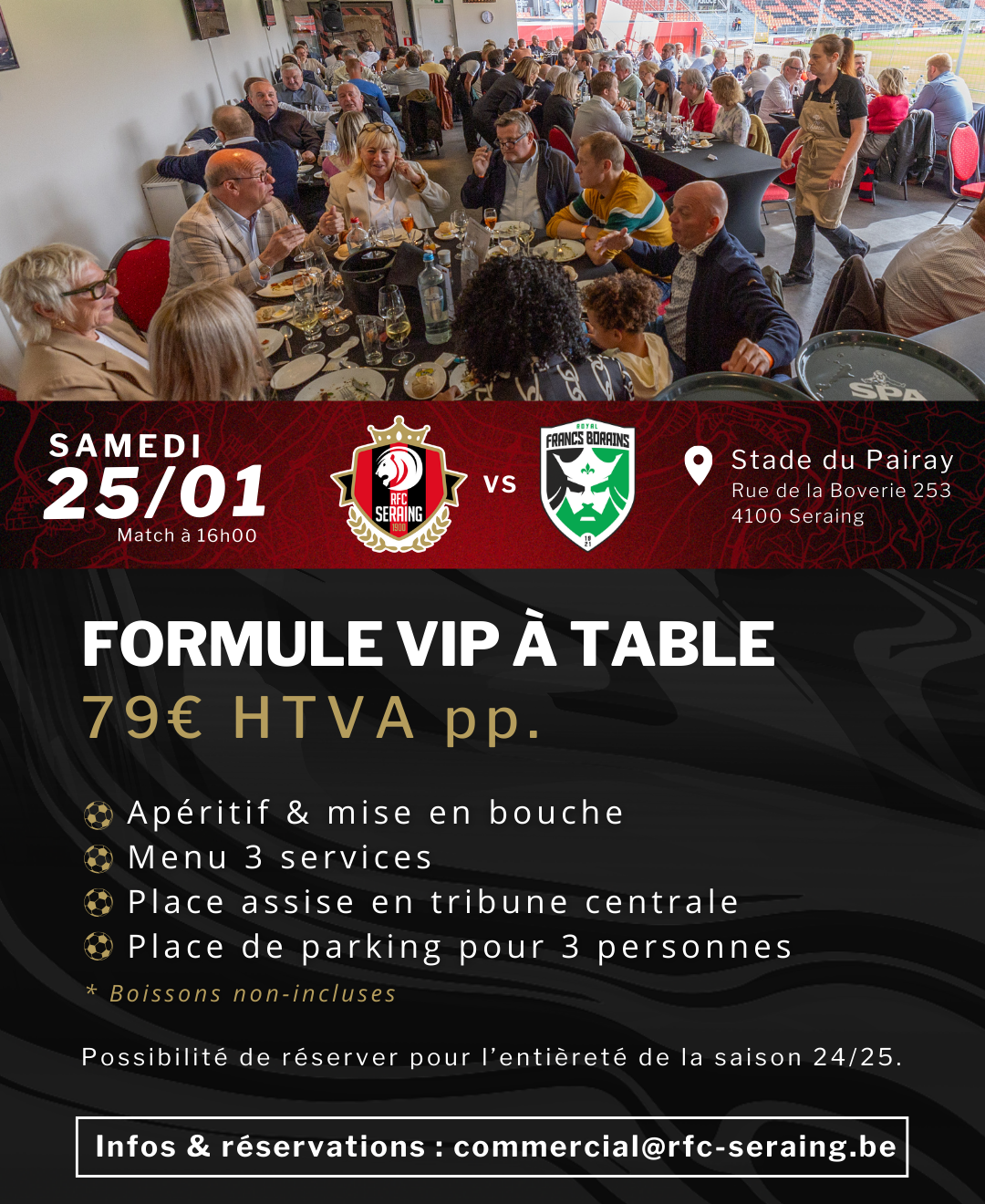 ✍️ Vous souhaitez réserver l’une de nos deux formules pour cette rencontre ou l’un de nos prochains matchs ? Contactez directement notre responsable commercial, Mr. 𝗣𝗶𝗲𝗿𝗿𝗲-𝗢𝗹𝗶𝘃𝗶𝗲𝗿 𝗗𝗶𝗿𝗶𝘅, à l’adresse suivante : commercial@rfc-seraing.be