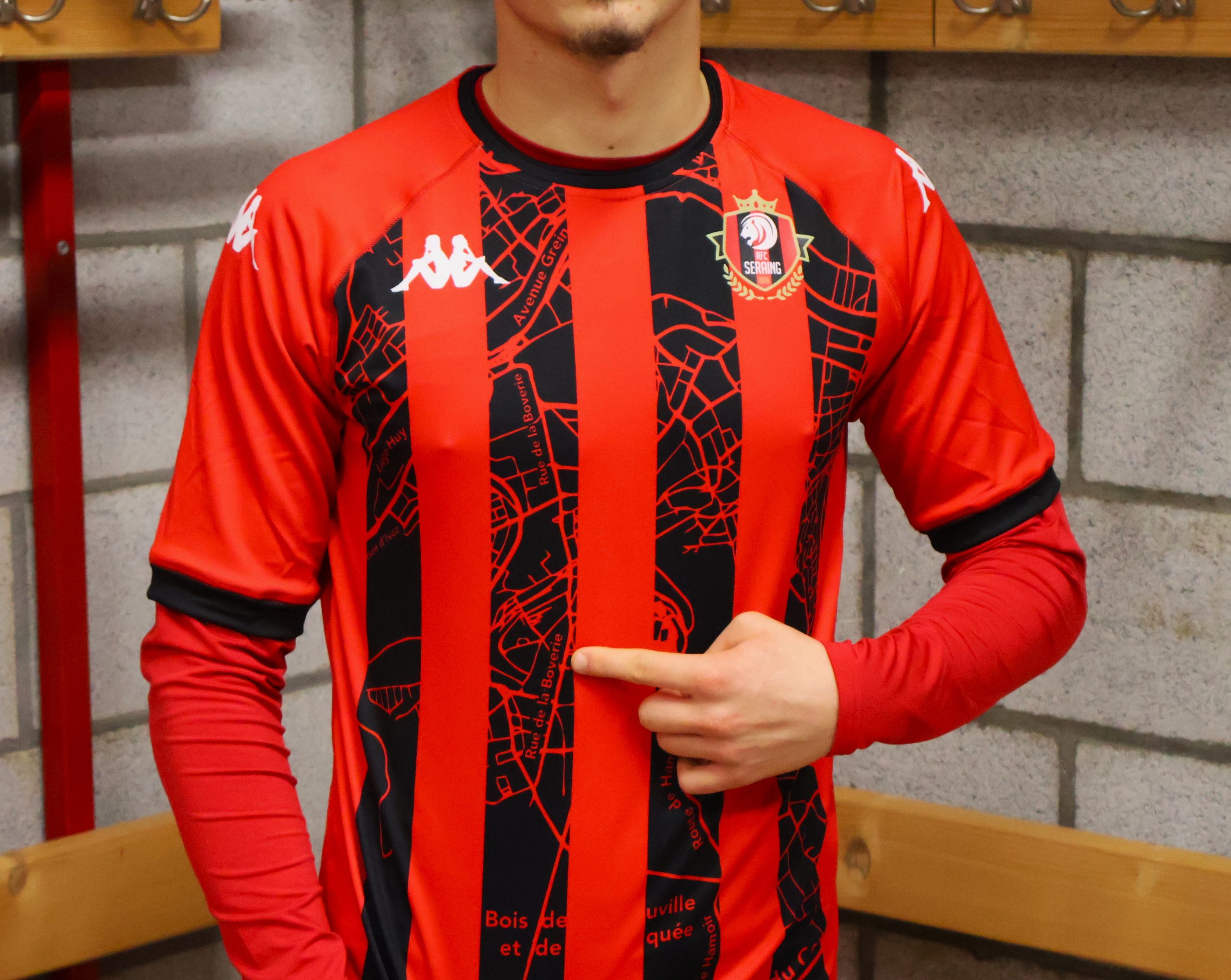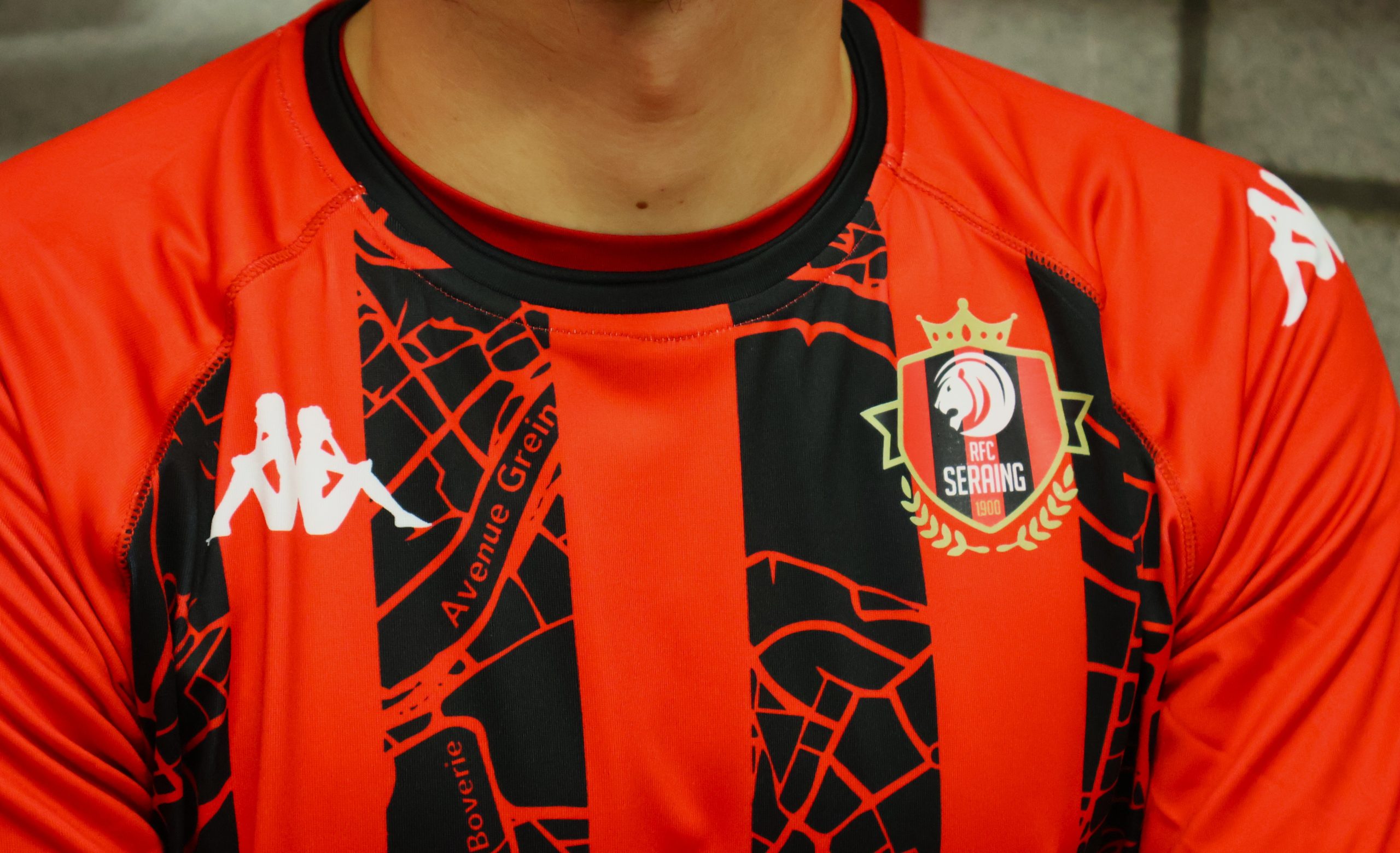Le RFC Seraing ne peut pas se séparer de la ville de Seraing et de ses alentours. C’est pourquoi, avec ce maillot domicile 23,24, nous avons voulu rendre hommage à notre belle région. Les bandes noires sur un fond rouge nous remémorent les anciennes tuniques d’antan, à l’époque de Francis Nicolay, Armand Dradon, Jean Boulet, et tant d’autres Métallos.
