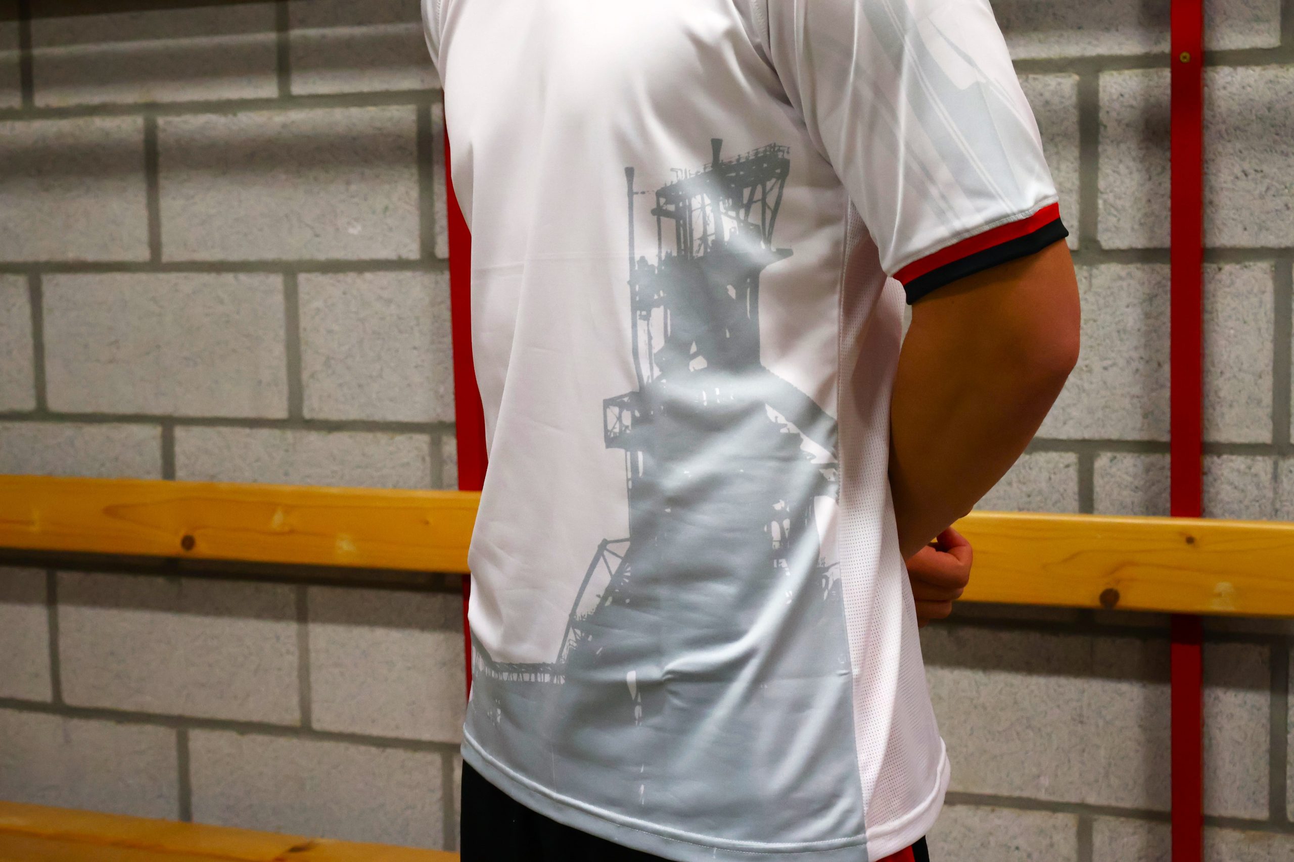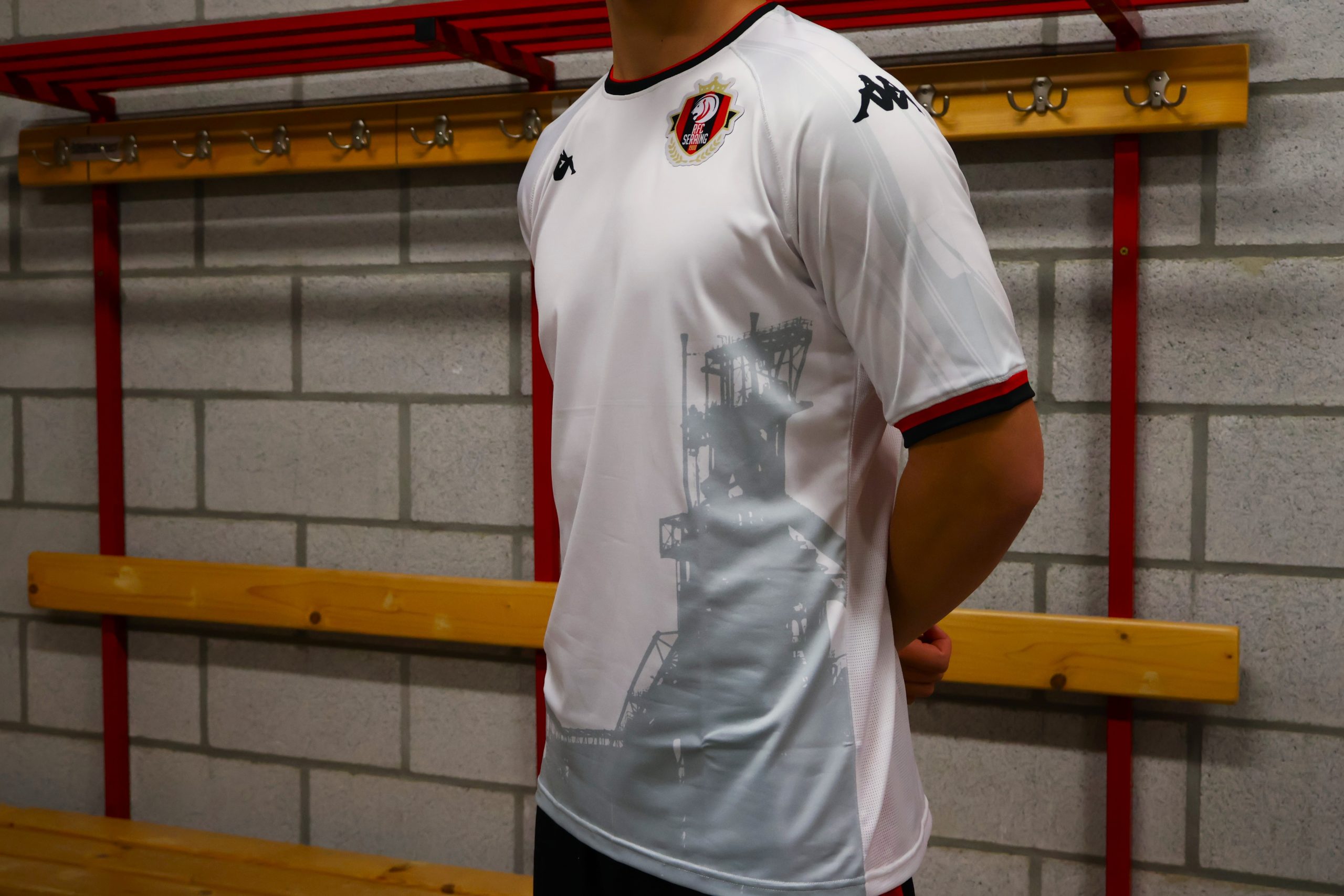 Cette saison, le blanc fait son grand retour au Pairay ! Notre maillot, avec des bandes rouges et noires sur les bordures des manches et du col, évoque fièrement les couleurs du club et son histoire. Au centre du maillot, l’image du haut fourneau historique d’Ougrée rappelle le passé minier de la région de Seraing. De plus, un motif de métal en fusion orne les manches des deux côtés.