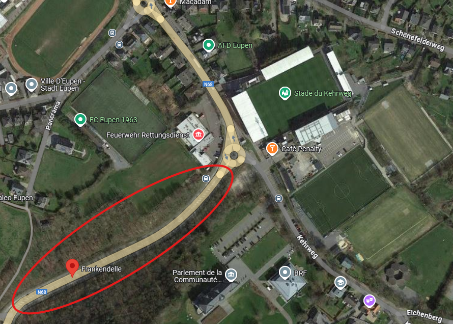 Les supporters visiteurs peuvent se garer, dans la limite des places disponibles, dans la rue Frankendelle : Frankendelle, 4700 Eupen.