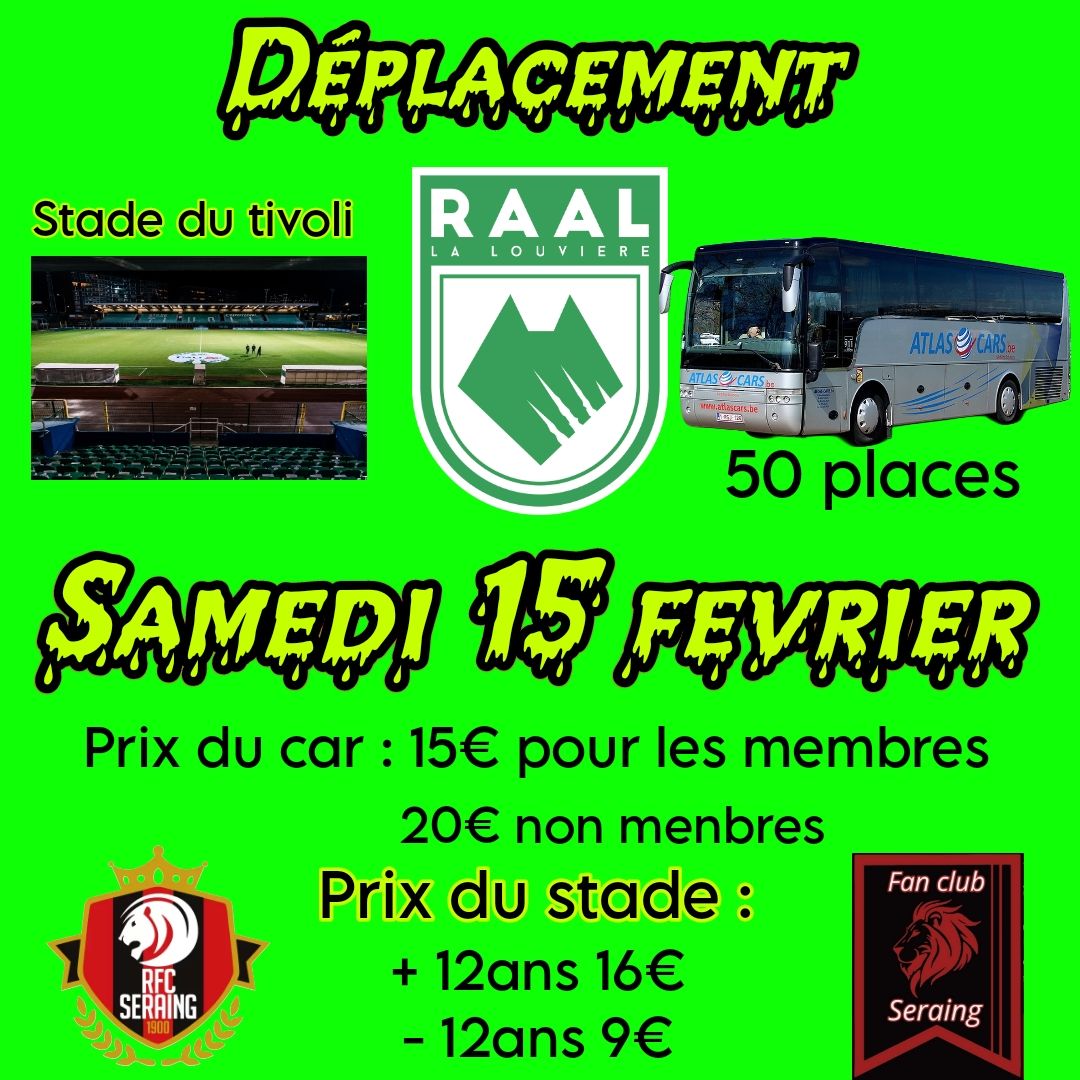 Le système du combi-car est imposé pour cette rencontre. Le RFC SERAING FAN CLUB organise cependant le déplacement en car pour les supporters souhaitant se rendre au Stade du Tivoli pour y encourager nos Rouge & Noir !