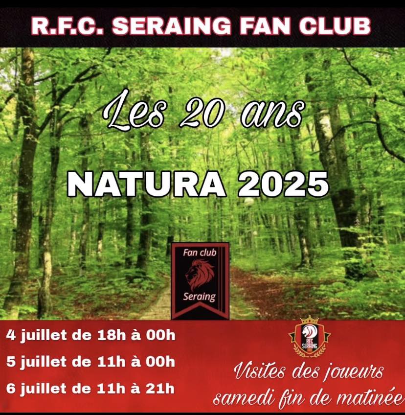 Le RFC Seraing Fan Club sera présent ce week-end (du 04 au 06 juillet) à la 20ème édition de Natura, qui se tiendra à la Mare aux Joncs !