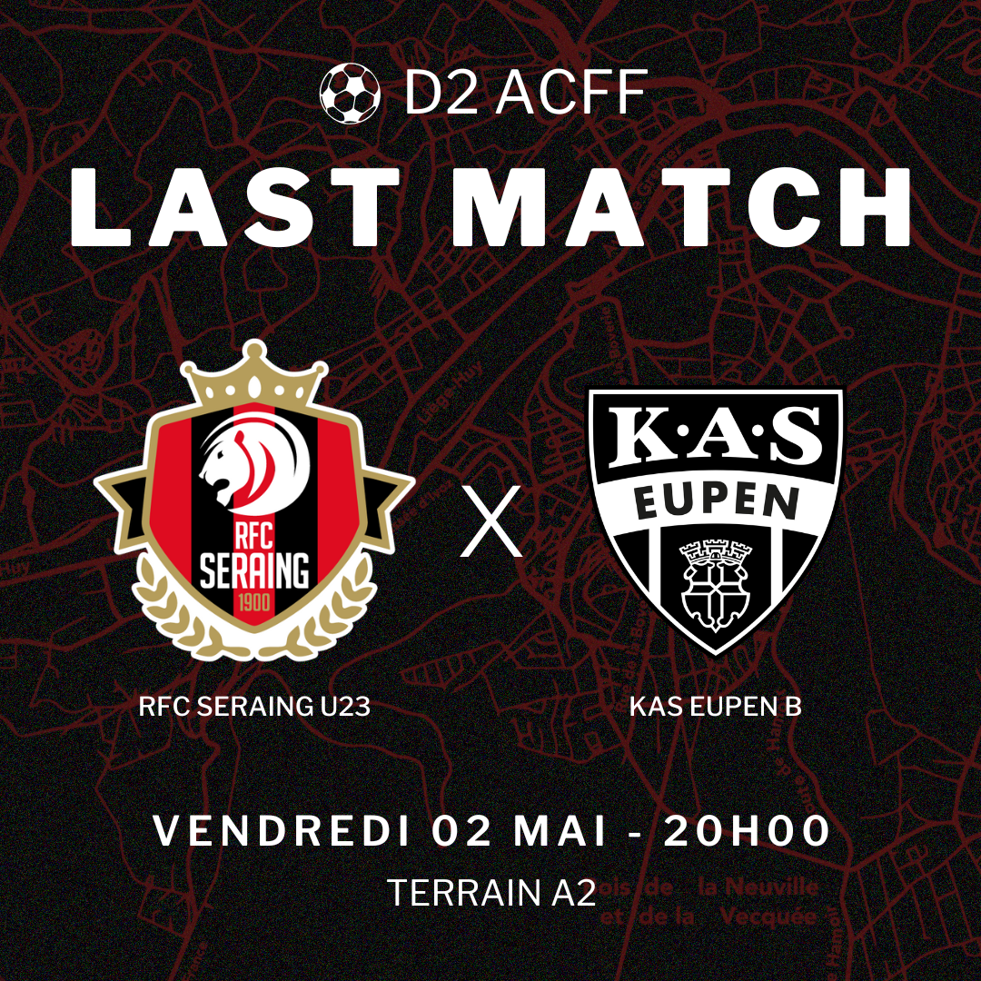 ⚠️ Le dernier match de la saison des hommes de Kevin Caprasse face à la KAS Eupen B, initialement prévu ce dimanche 04 mai à 15h00, aura finalement lieu ce vendredi 02 mai à 20h00, sur le terrain A2 des installations du Pairay !