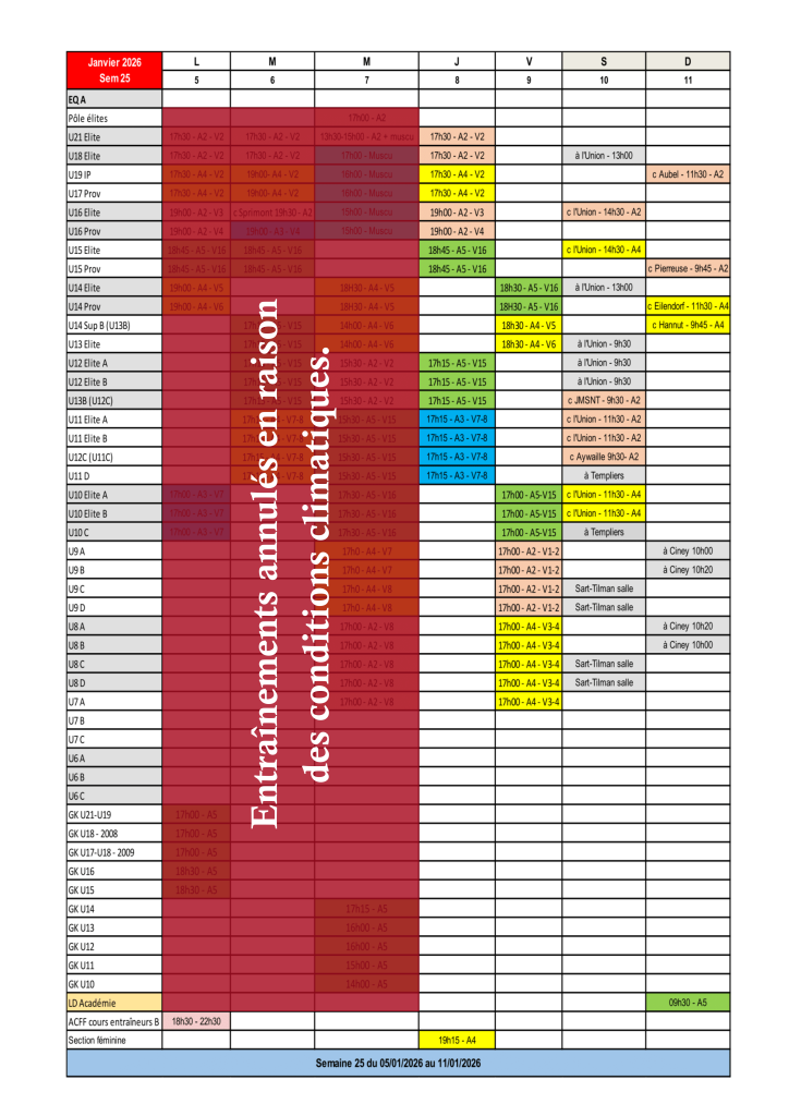 Mise à jour : Entraînements annulés – Lundi 05, Mardi 06 & Mercredi 07 Janvier