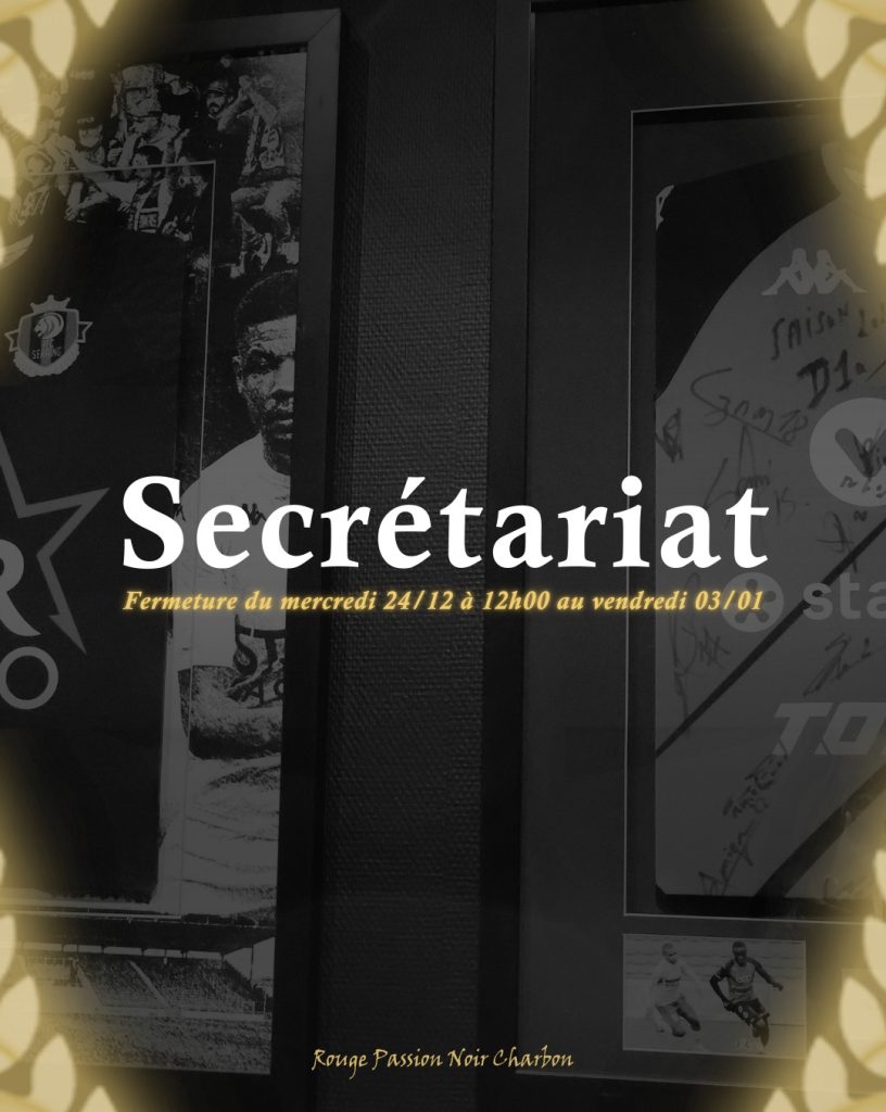 Le secrétariat de notre équipe première fermera ses portes à l’occasion des fêtes de fin d’année, à partir de ce mercredi 24 décembre à 12h00 et jusqu’au vendredi 03 janvier inclus.